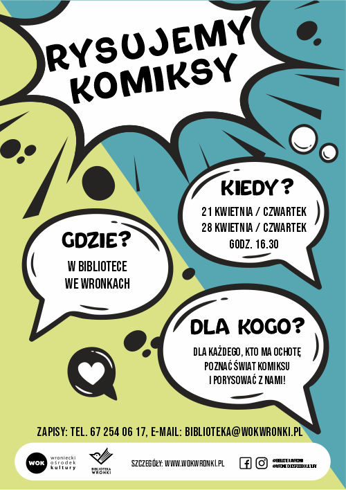 Rysujmy komiksy! Warsztaty komiksowe Mikołaja Tkacza w Bibliotece we Wronkach. Opowiadasz historie, ale nie wiesz jak je narysować? Rysujesz, ale nie wiesz jak opowiadać? Mikołaj Tkacz podczas swoich warsztatów komiksowych pokaże i dokładnie wyjaśni jak robić komiksy. Autor Naprawdę nieśmiesznych rysunków i członek komiksowej grupy Maszin odpowie: